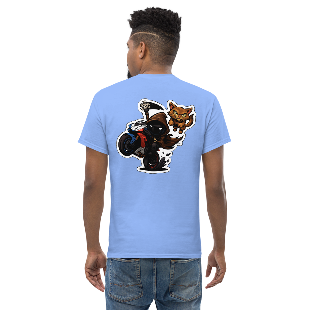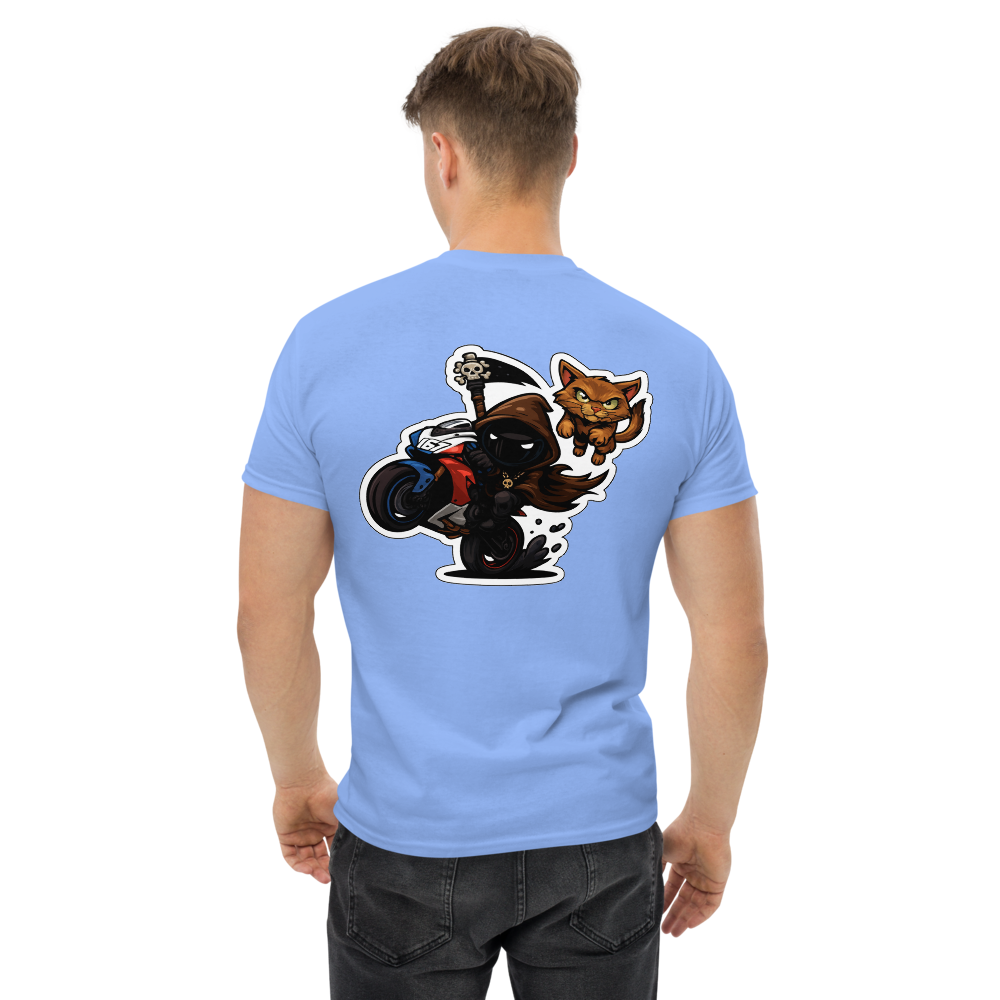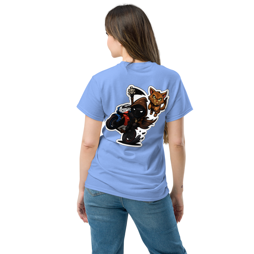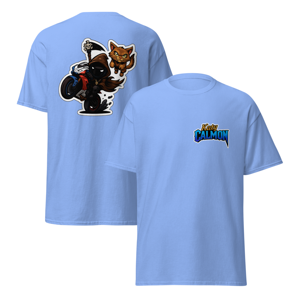 Sur le devant, le logo Katy Calmon affiche ta passion avec élégance. Au dos, la mascotte cartoon – un rider mystérieux accompagné de son chat intrépide – offre un visuel dynamique et ultra accrocheur 😺🏍️💨