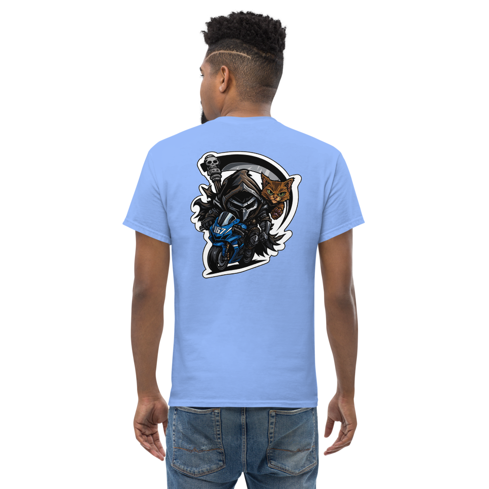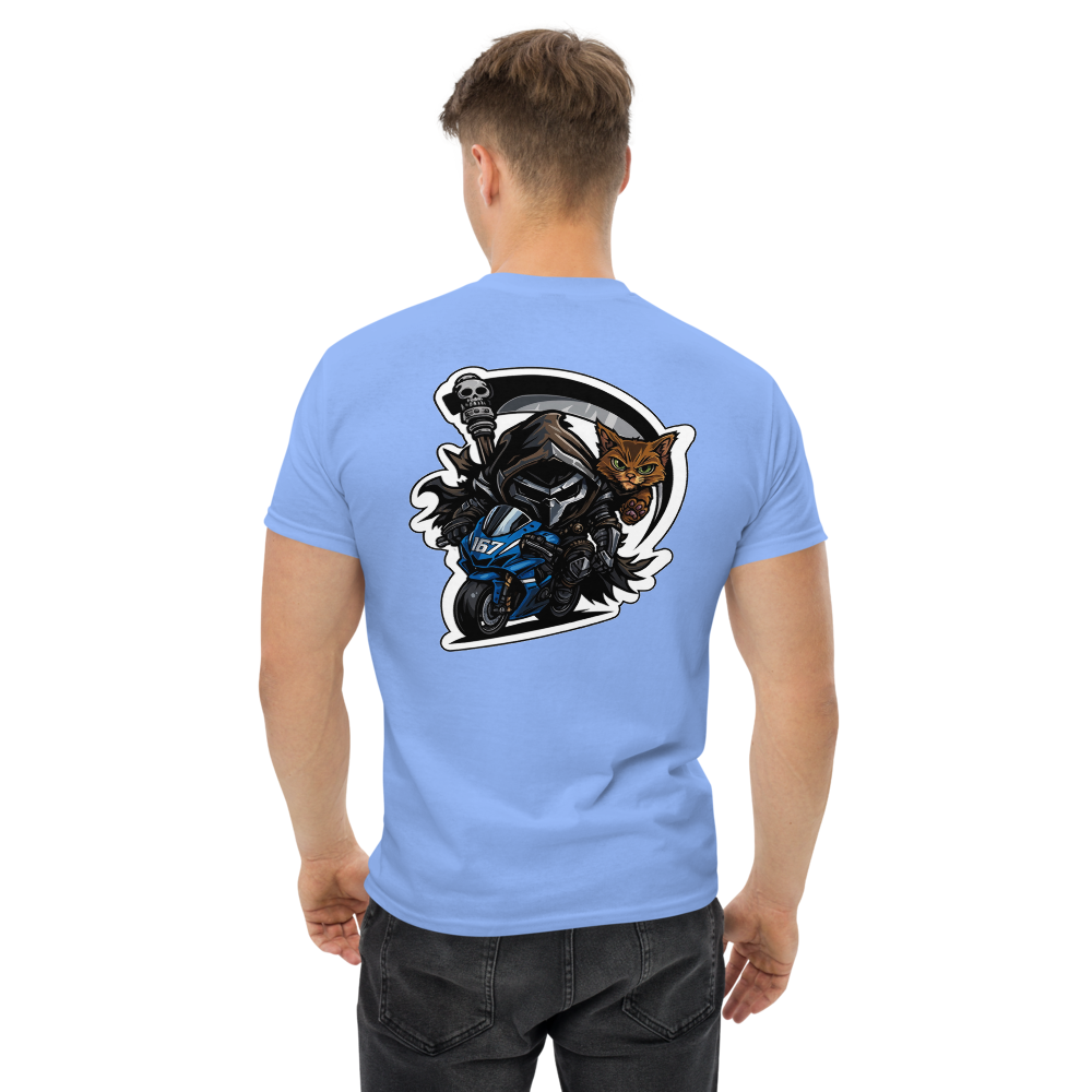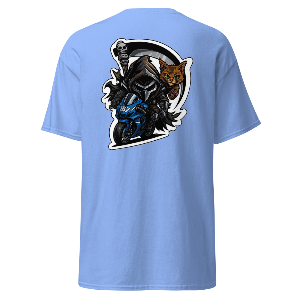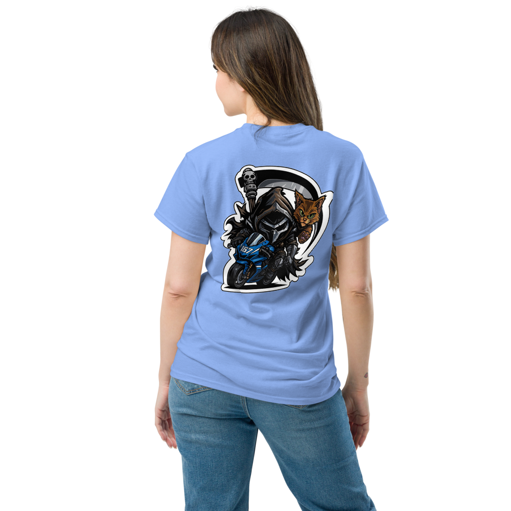 Sa couleur Carolina Blue, douce mais percutante, met parfaitement en valeur le design guerrier : un rider sombre, déterminé, accompagné de son fidèle chat au regard perçant. Un duo explosif qui symbolise force, maîtrise et esprit de combat 🏍️🔥🐱